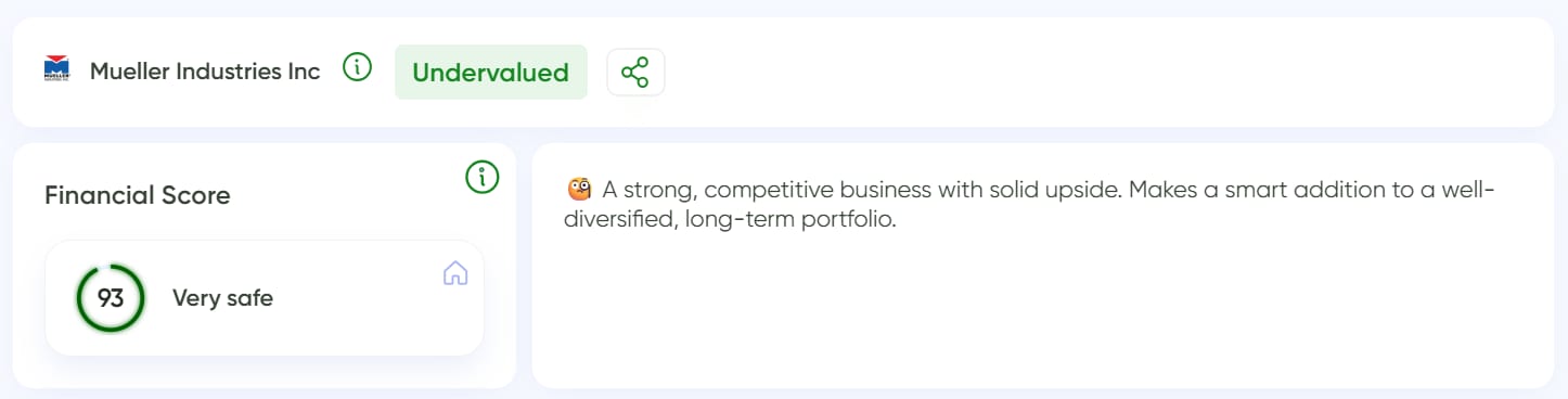 Mueller Industries manufactures and distributes metal products across copper, brass, aluminum, and plastic systems used in plumbing, HVAC, and industrial applications. The business benefits from steady demand tied to construction and infrastructure, while maintaining strong margins and consistent free cash flow.