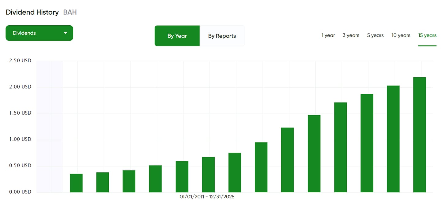 Booz Allen Hamilton currently offers a dividend yield of approximately 2.98%. Dividend payments have increased consistently for 13 consecutive years, reflecting a structured and earnings-supported payout policy.